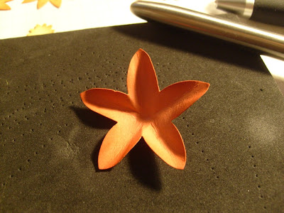 7. Now it's time for shaping the different parts of the flower. I started with the realy rust punch outs which will be down on the bottom of the flower. I pinched each petal with round nozzle (sp?)pliers and folded the sides up.