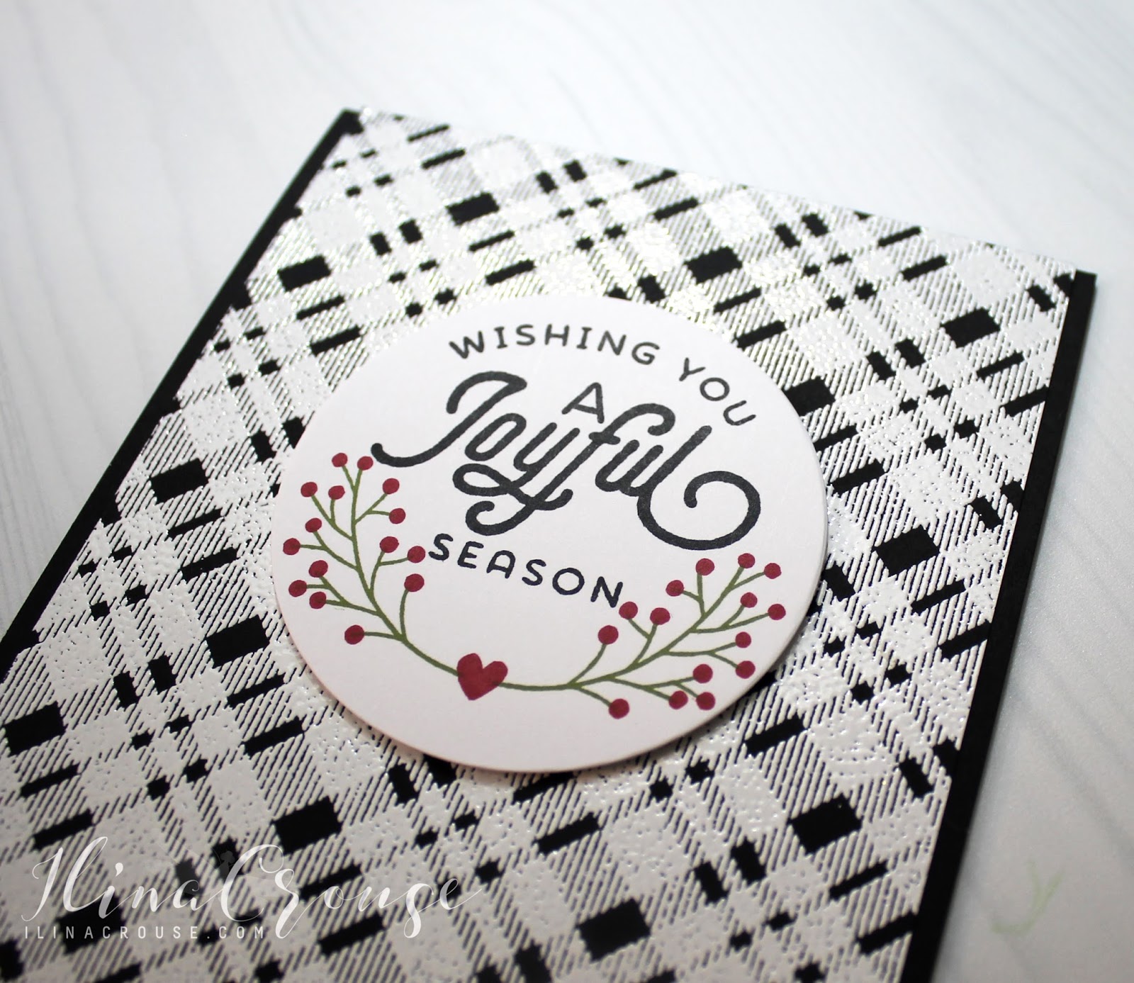I am in LOVE with this Plain Background! I stamped it on black card stock and embossed with white embossing powder. I used the already released Merry and Bright Boughs set to create the sentiment and I used Peppermint Scrub and Eucalyptus ink pads for the berries, heart and branches. The little heart is from the Birds of a Feather set ;)