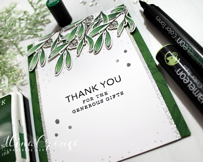 For my card I used Thank you Messages set and the Happy Holly Days set and dies. I stamped several times the holly, die cut and . colored with my Chameleon Pens. I arranged the branches on my panel and cut off the excess. Then stamped the sentiment, adhered to Mossy Meadow card panel (retired SU! color) and added some silver thin washi tape.
