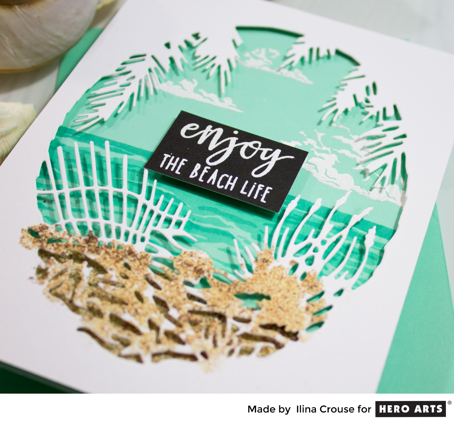 For my next card I used Seas the Day Seagulls along with the Wave Sea Confetti die. To make the card you will need to die cut the cover die from pool layering paper, and adhere to pool note card. Stamp the imaged on CP Designs premium white card stock with Intense Black ink and color with copics. Die cut. Die cut a circle from Vellum and apply sand embossing powder. Arrange and adhere your card.
